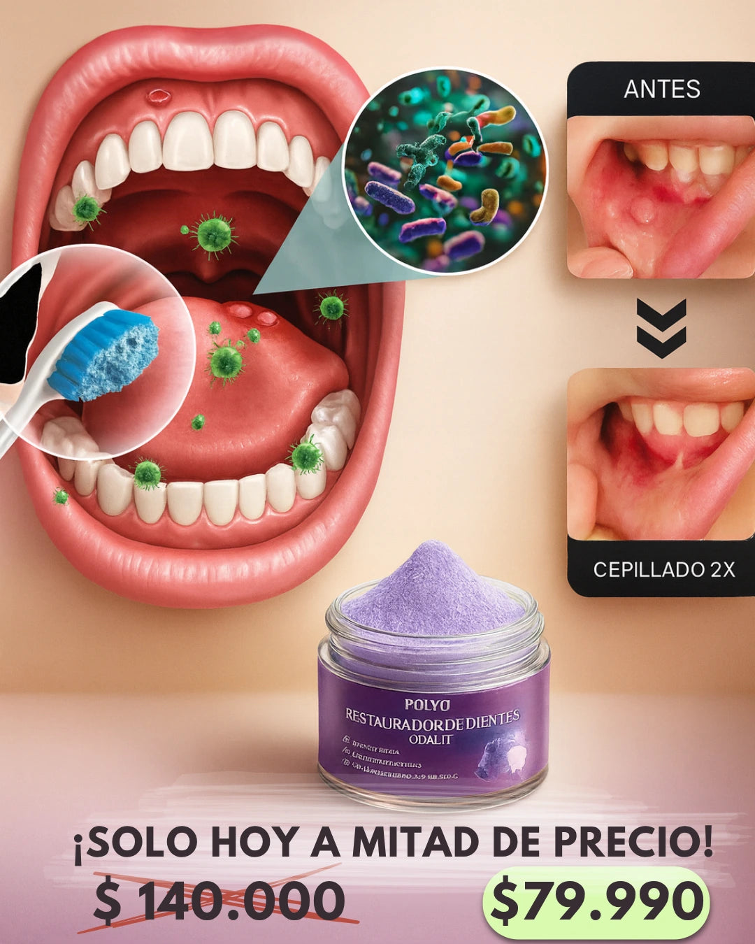 Durante años, sufrí de gingivitis crónica, que me dejaba con hinchazón, enrojecimiento, sensibilidad y dolor persistentes al comer y hablar. A pesar de cepillarme los dientes y usar hilo dental con cuidado, la inflamación persistía y se acumulaba placa, que simplemente no se desprendía. Después de usar el Polvo Mineral para Restauración Dental ODALIT™ , la inflamación se redujo significativamente en dos días. Las propiedades antiinflamatorias naturales de este polvo son tan efectivas que mis encías ya no me duelen y están más sanas que antes.